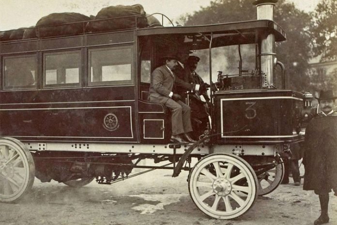 Siete horas: era el tiempo que se empleaba en llegar, desde A Coruña a Santiago, en la diligencia llamada Ferro-carrilana. Ahora, en 1900, se podría hacer en menos de cuatro y a una velocidad media de unos 16 kilómetros a la hora. Para ello se utilizarían los modernos ómnibus de vapor de la marca francesa De Dion-Bouton. Elegantes y robustos, estos ómnibus se distinguían por su típica chimenea y un motor delantero a vapor, de unos 20 a 35 caballos de fuerza, manejado por un maquinista y un fogonero. Con una longitud de hasta unos seis metros y medio y una anchura de dos metros y medio, tenía capacidad para llevar 14 o 18 personas, existiendo modelos diferentes, con o sin berlina específica para pasajeros de primera clase. Sus llantas eran de acero. Fáciles de manejar, consumían unos cuatro kilos de carbón de cok por kilómetro, disponiendo de carboneras de unos cien kilos y necesitando de puntos donde repostar agua y carbón.