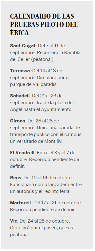 Cataluña se suma a las pruebas de vehículos colectivos sin conductor como las que se están haciendo en países como Francia, Suiza, Alemania, Holanda, Estados Unidos, Australia o China. Ocho municipios catalanes verán circular a partir de septiembre un minibús autónomo. Será una prueba piloto de cuatro días en cada ciudad: Sant Cugat, Terrassa, Sabadell, Girona, El Vendrell, Reus, Martorell y Vic. Una gira que impulsan la Generalitat y la Asociación de municipios por la movilidad y el transporte urbano (AMTU) y que pagarán a media los ayuntamientos, el gobierno catalán y las empresas EasyMile (fabricante del vehículo) y Transdev (el operador). El coste del proyecto es de 300.000 euros.