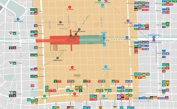 A los carriles exclusivos del Metrobus de la 9 de Julio los utilizan 11 líneas: las 9, 10, 17, 45, 59, 67, 70, 91, 98, 100 y 129. Desde las 22 de este viernes hasta el sábado a las 14, en dirección hacia el norte se desviarán por Moreno, Luis Sáenz Peña, Paraná y Paraguay. Mientras tanto, hacia el sur tomarán Córdoba, Talcahuano-Santiago del Estero e Hipólito Yrigoyen.