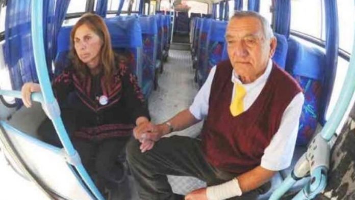 Mario Núñez (71) lleva a su esposa Fresia en el colectivo que conduce.