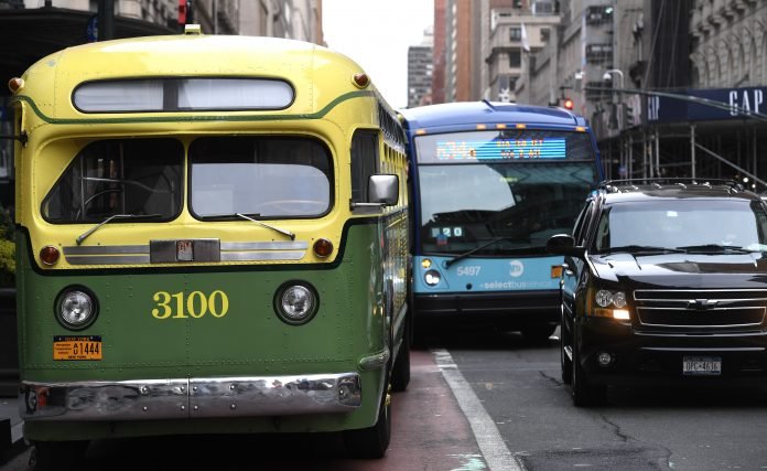 Un bus antiguo de MTA New York de 1956 General Motors TDH 5106 El estilo clásico de «aspecto antiguo» recuerda a miles de autobuses similares que operaban en toda la ciudad desde la década de 1950 hasta principios de la década de 1970.