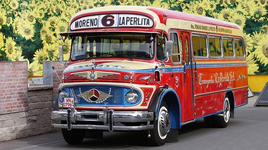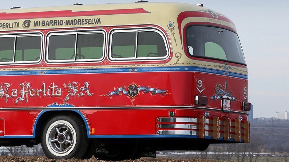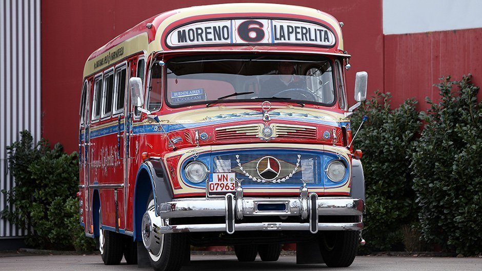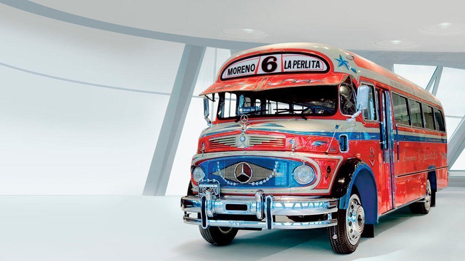 Museo de Mercedes-Benz en Stuttgart (Alemania). Entre sus joyas automovilísticas hay una que destaca especialmente por su tamaño y rico colorido. Es ‘La Perlita’, un pintoresco autobús argentino o colectivo que en su día alegró las calles de Buenos Aires con su ornamentada carrocería y que hoy ocupa un sitio relevante en la historia de la marca alemana.