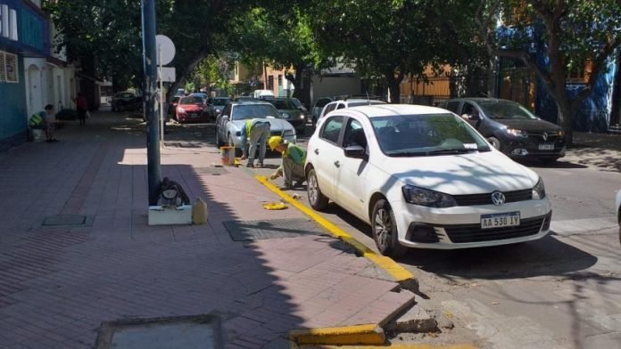 Este jueves comenzaron a pintar de amarillo los cordones en el tramo de la avenida San Martín -y las calles aledañas- donde funciona el Metrobus.