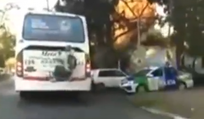 Un hombre viajaba colgado de la tapa del motor de un interno de la Línea 159 para evitar pagar el boleto. Mientras un conductor que conducía detrás iba filmando, el colectivo freno en una parada donde justo se encontraba un móvil policial.
