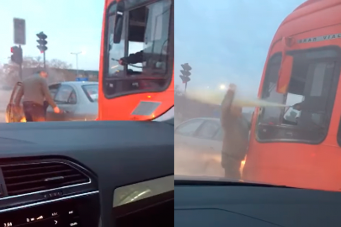 La discusión entre un automovilista y un chofer de un autobus se volvió viral luego que en el video, filmado por otro automovilista, se observara que el conductor bajó a increpar al chofer y éste le vació el matafuego en la cara.