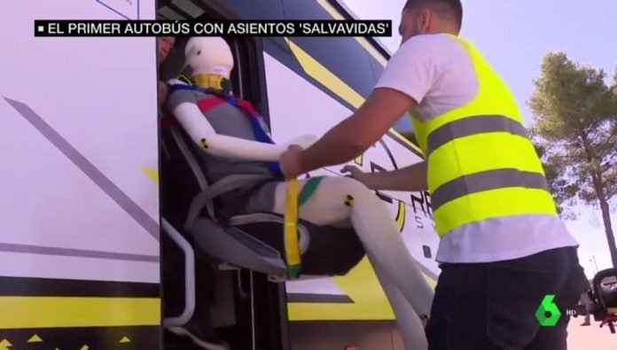 El futuro de los autobuses, según los expertos, pasa por un sistema de seguridad español que convierte los asientos en salvavidas. Sergio de Rico, creador del Sistema ‘E-rescue’ explica que «el pack de rescate está debajo del asiento y contiene el collarín y el arnés de inmovilización».