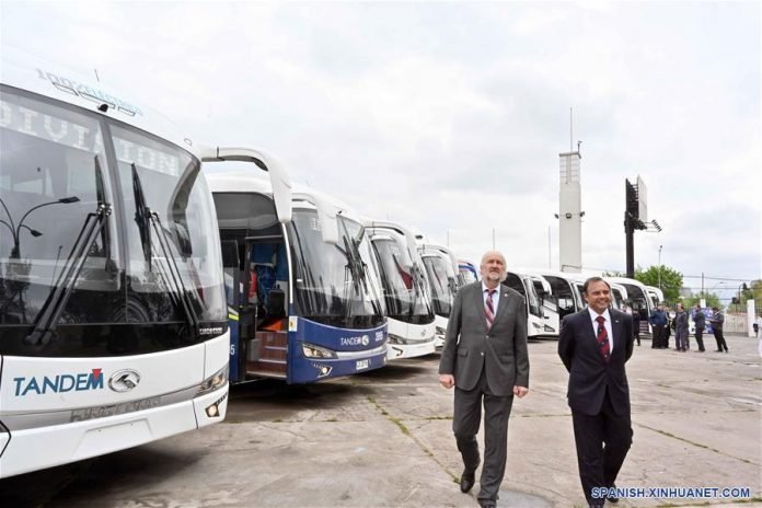 Foto: Imagen cedida por el Ministerio de Minería de Chile del ministro chileno de Minería, Baldo Prokurica (i), y el subsecretario de Transportes de Chile, José Luis Domínguez (d), asistiendo a la presentación de buses eléctricos chinos de marca «King Long», en Santiago, capital de Chile, el 14 de octubre de 2019. Prokurica presentó el lunes 12 buses eléctricos chinos de marca «King Long» que transportarán a trabajadores en varias faenas mineras del país sudamericano. (Xinhua/Ministerio de Minería de Chile)