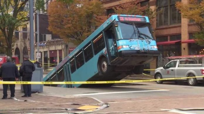 En la zona céntrica de la ciudad de Pittsburgh, estado de Pensilvania, Estados Unidos, un colectivo que transporta empleados del puerto de la ciudad quedó semihundido en un sumidero. El accidente ocurrió en la intersección de las calles 10 y Penn Avenue.