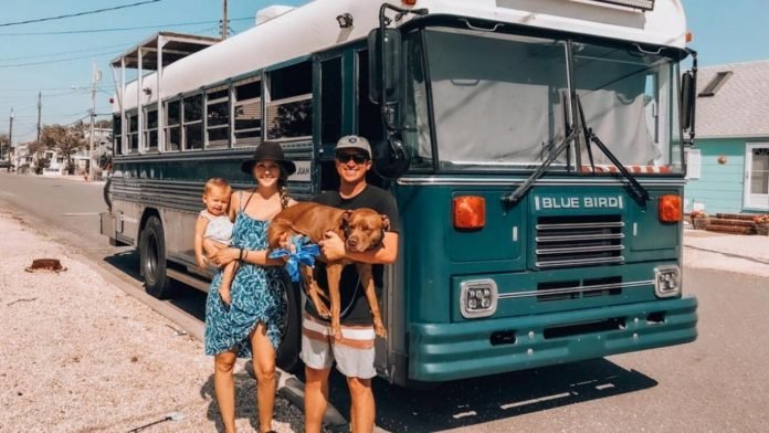 Una familia de cuatro — Kristin, la madre; Will, el padre, Roam, el bebé; y Rush, el perro — compraron un autobús de la Fuerza Aérea Blue Bird desmantelado en 1992 y lo han convertido en su propia casa con ruedas.