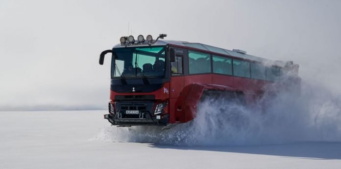 Aunque pensar que un autobús se puede mover fácilmente por el hielo de un glaciar puede sonar a quimera, lo cierto es que es posible. Eso sí, no puede ser un vehículo cualquiera, sino un bus que más bien parece sacado de una película de ciencia ficción.