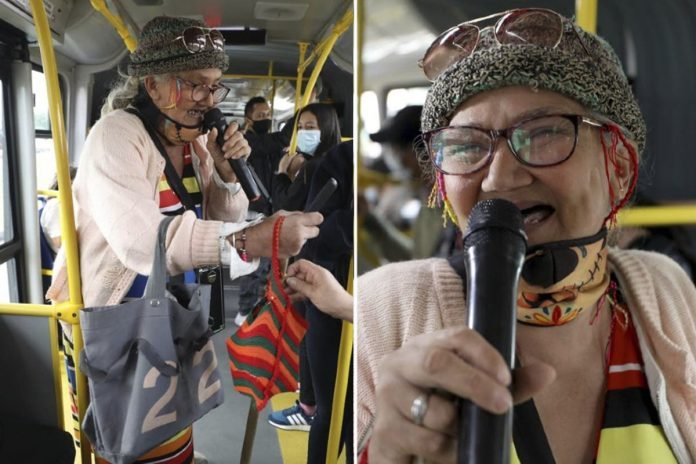 Cuando la música comienza a salir de su altavos portátil, la mujer de 69 años se convierte en una prolífica rapera cuyas rimas hacen reír a los pasajeros del Transmilenio, el sistema de autobuses públicos de Bogotá, atestado y azotado por el crimen.