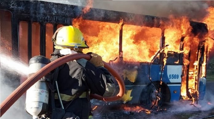 El chofer intentó apagar el fuego con el matafuego pero no lo logró y en pocos minutos la unidad se consumió en llamas