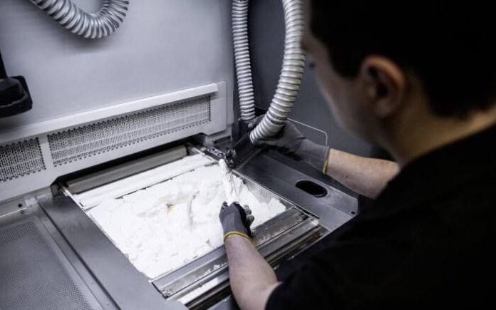 El polvo requerido se prepara en una estación de procesamiento donde la pieza de repuesto impresa también se libera del polvo residual en un paso final. Un sistema de granallado y un compresor de aire se encuentran en una habitación adyacente: el sistema de granallado alisa la superficie de los componentes para un acabado perfecto. Aquí, las piezas de repuesto impresas también se pueden pintar en una gama limitada de colores. El compresor proporciona aire comprimido a los sistemas. El contenedor también está equipado con una aspiradora industrial, un filtro de aire y un sistema de aire acondicionado.