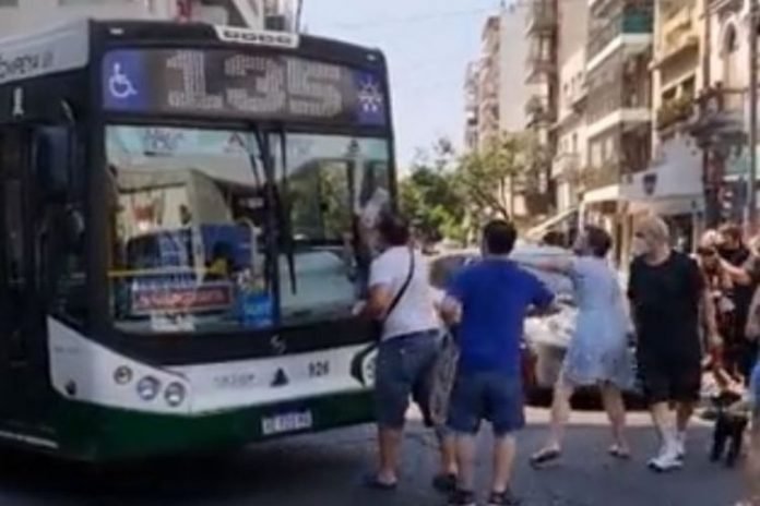 En medio del corte de calles, un chofer de la Línea 135 intento avanzar y uno de los damnificados le tapó el parabrisas con un cartel y luego le pegó en el espejo con intención de romperlo al ver avanzar la unidad.