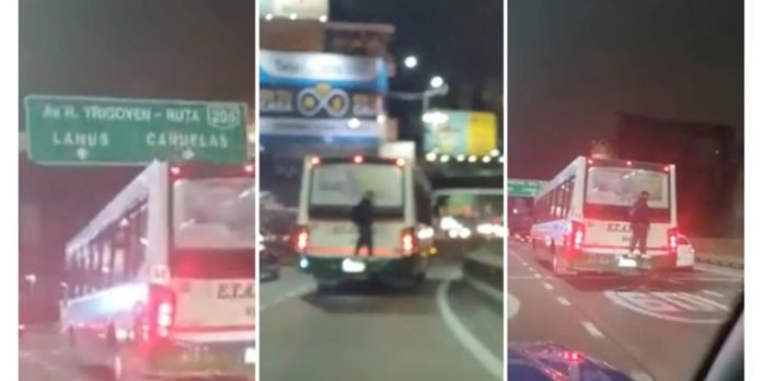 Un conductor circulaba por la bajada del Puente Pueryrredón cuando se sorprendió al ver a un hombre colgado de un colectivo en la localidad bonaerense de Avellaneda.