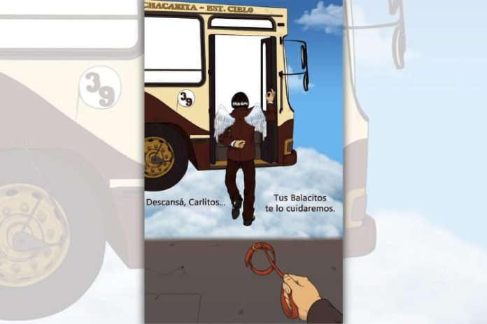 Carlitos Balá continúa recibiendo mensajes y homenajes. Uno de ellos lo realizó Iván, a través de la técnica digital, donde se ve a Carlitos con alas de ángel subiendo a un colectivo de la Línea 39 que en sus destinos dice «Estación Cielo» y a su perro Angueto sobre la vereda despidiéndolo…