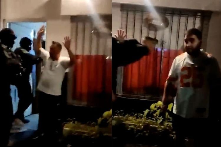 La secuencia, que quedó grabada en un video que se viralizó esta mañana, muestra a uno de los acusados en el ingreso de su vivienda, y cómo una gran cantidad de agentes de seguridad ingresan hasta reducirlos a él y a un joven que lo acompañaba.
