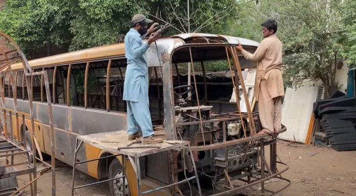 Trabajadores en un galpón a cielo abierto, con mínimas medidas de seguridad y casi sin herramientas carrozan colectivos desde cero y los dejan como 0 km.