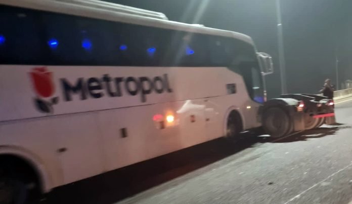 Un colectivo y un camión protagonizaron un impresionante choque este miércoles por la noche en la Autopista Buenos Aires – La Plata a la altura del kilómetro 45.