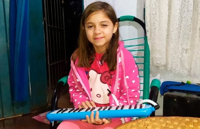 Junto a su padre, Malena enterneció a los pasajeros de los colectivos en Misiones, y se la rebusca para juntar el dinero que necesita para acceder a un teclado profesional.