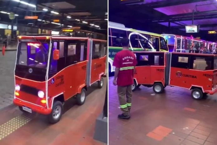 La unidad circula por las plataformas de una terminal de ómnibus de Curitiba mientras las familias esperan al colectivo real y dejan a sus hijos divertirse un rato.