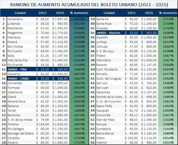 En el mismo lapso, la inflación acumulada fue de +870,1 %, mientras que en todas las ciudades del país las tarifas urbanas aumentaron por encima de ese nivel, evidenciando la magnitud del ajuste tarifario luego de varios años de congelamiento y atraso.