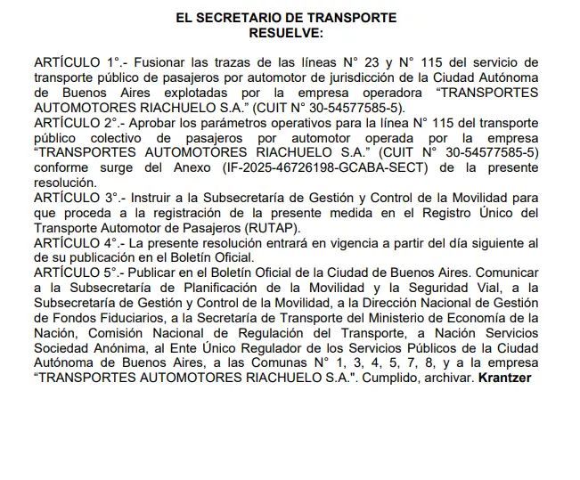 A través de la Resolución 180/2025 publicada el 29 de octubre, se dio curso a la fusión de ambas servicios operadores por la empresa Transportes Automotores Riachuelo S.A.